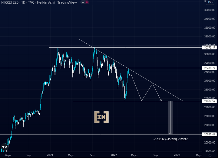 Por otro lado, de vulnerar el área de soporte de los 27000 puntos con máximos mas bajos la probabilidad se incrementaría en un 75%. De continuar la tendencia bajista y una perforación con gran fuerza en el área de soporte de los 24687.57 puntos con objetivo los 20935.41 puntos.