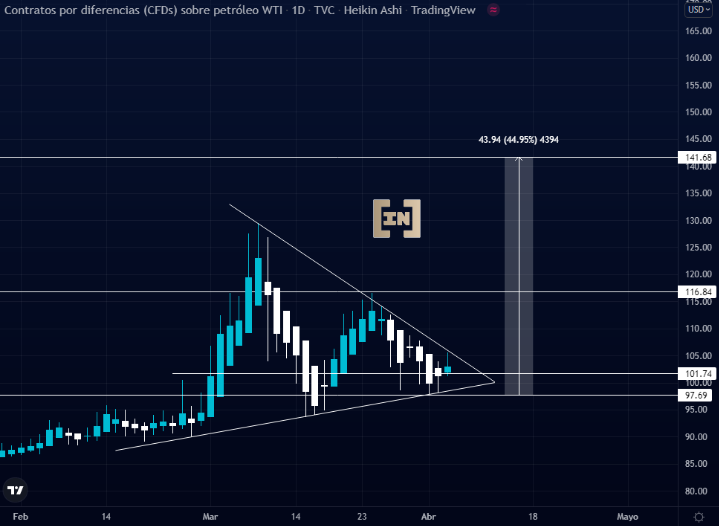 Sponsored SponsoredSu cotización se ha venido comprimiendo con máximos y mínimos en un mismo nivel de soporte los 100 dólares. La ultima vela de Heikin Ashi indica también el posible inicio de un nuevo bull market para el petróleo, pues ha cerrado cubriendo más del 50% del ultimo tramo del triángulo y cierra dejando una cola en la parte superior de la vela en tiempo diario.