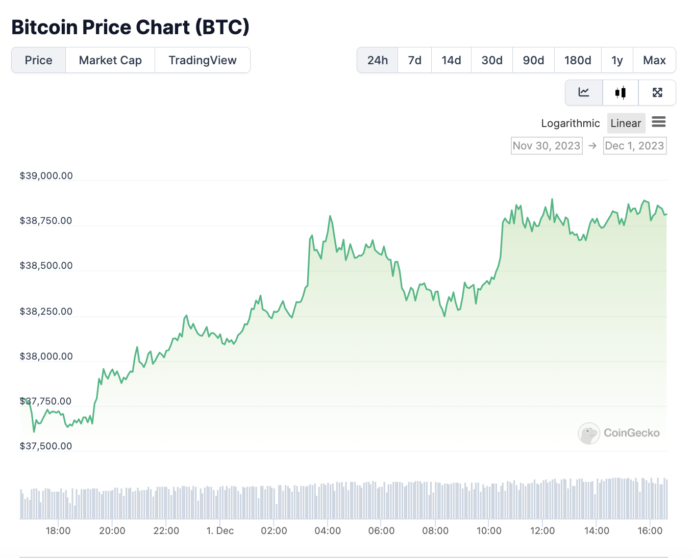 En el momento de escribir este artículo, BTC se cotiza a 38,605 dólares, superando su valor más alto desde la primavera de 2022. Según CoinGecko, en las últimas 24 horas el precio del activo ha aumentado 2% y el volumen de operaciones diario superó los 22,4 mil millones de dólares.