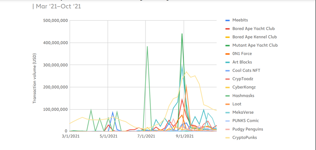 CryptoPunks, ha sido la colección de NFT más popular durante este periodo de tiempo, aun cuando su lanzamiento data del 2017, teniendo hasta la fecha más de 3,000 millones de dólares en volumen de transacciones desde marzo de 2021. Sin embargo, existen otras colecciones que “extrañamente” experimentaron breves pero grandes picos de actividad de transacciones sin llegar a ganar una popularidad constante.