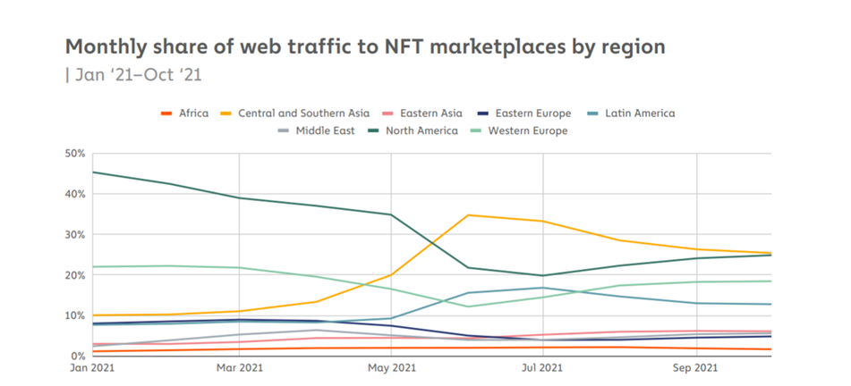 Las cifras sugieren que, al igual que las criptomonedas convencionales, los NFT han alcanzado una gran popularidad global, ya que ninguna región representa más del 40% de las visitas mensuales a la web de OpenSea desde marzo de 2021.