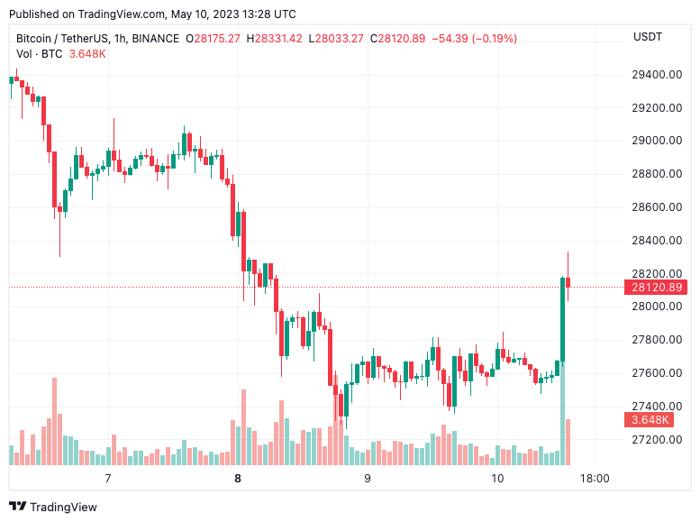 Con la noticia positiva respecto a la inflación, el precio de bitcoin ha respondido con una subida repentina. Según TradingView, el par BTC/USDT ha recibido un gran impulso alcista rebasando la marca de los 28.000 dólares con facilidad.