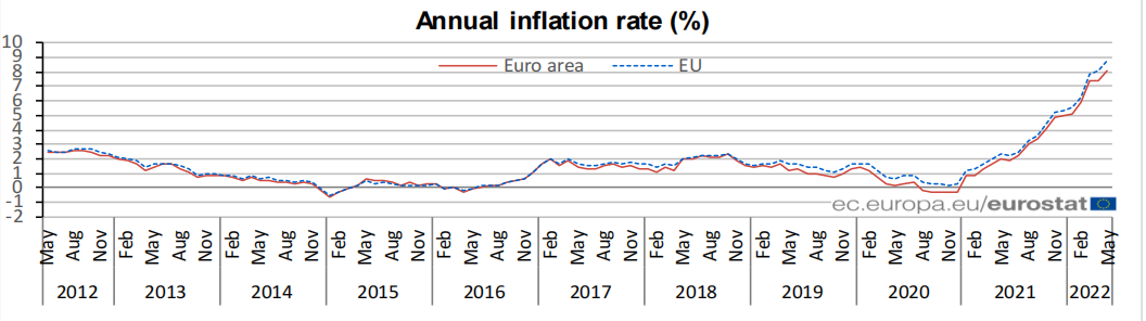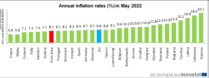 Las cifras de la agencia de estadísticas de la UE, Eurostat, mostraron que la inflación de los precios al consumidor aumentó un 0.5% más con respecto al 8,1% en mayo.