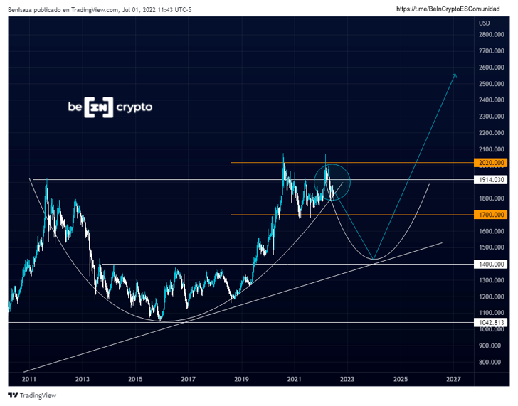 Sin embargo, el oro podría descender su cotización al nivel de los 1,480 dólares por onza, cumpliendo con la formación chartista de taza con asa, proponiendo un escenario mucho mas alcista con objetivo alcanzar a largo plazo los 3,500 dólares por onza.
