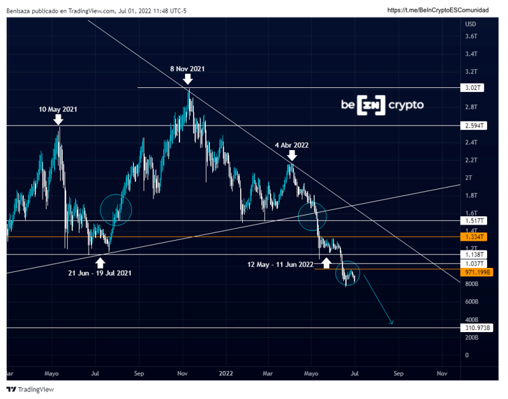 En un segundo escenario, mientras la capitalización total se mantenga por encima de los 700 mil millones de dólares para el mes de julio de 2022, podría presentar un segundo intento por superar la barrera principal del billón de dólares.
