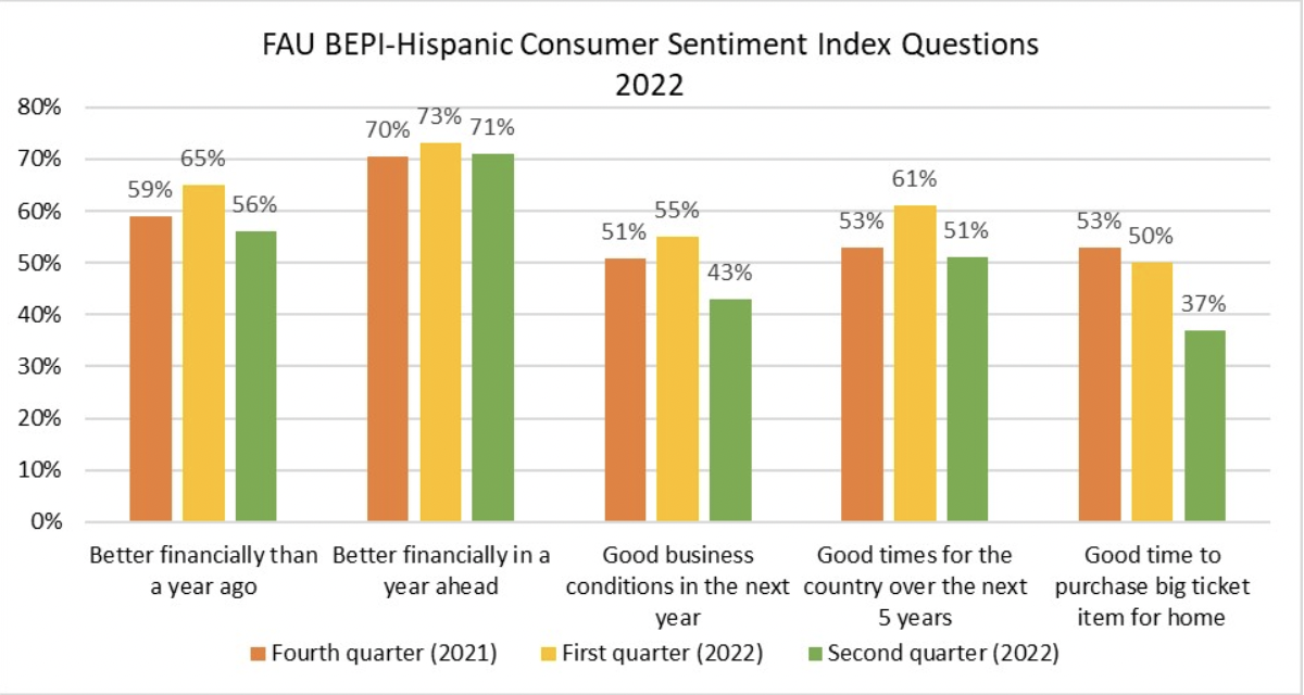 De acuerdo a una encuesta realizada por la Florida Atlantic University (FAU), el Índice de Sentimiento del Consumidor Hispano cayó a 78.3 de 92 en el primer trimestre, 86.7 en el cuarto trimestre de 2021 y 90.8 para el mismo trimestre del año pasado. Esto según la Iniciativa de Sondeo de Economía y Negocios de (FAU BEPI) realizado por la escuela de negocios de la universidad.