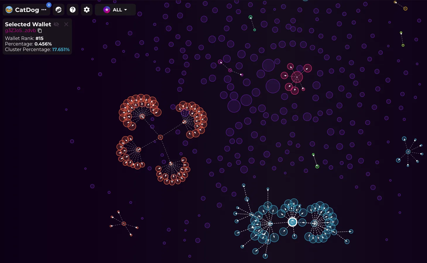 La firma de análisis de blockchain Bubblemaps ha emitido advertencias sobre los movimientos de mercado de CATDOG. Su investigación revela que 140 monederos conectados poseen el 40% del suministro de la moneda, una clara señal de alerta en el sector cripto. Por ejemplo, un monedero, g3ZJo5, inicialmente acaparó el suministro de CATDOG, distribuyendo rápidamente partes a otros 60 monederos mientras retenía el 17.7%.