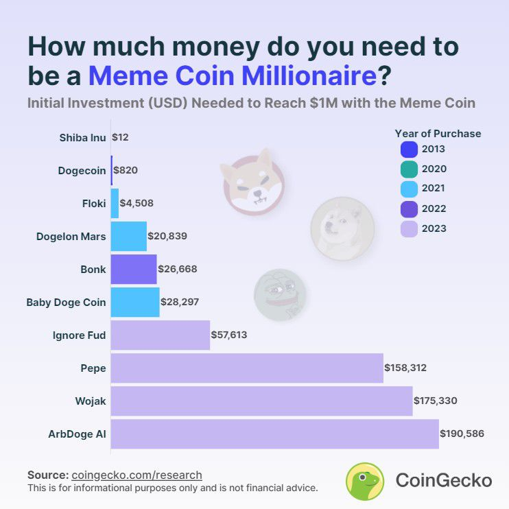 Un inversionista habría necesitado invertir un promedio de 66,298.25 dólares para convertirse en un millonario de criptomonedas meme, según la investigación de CoinGecko de 10 retornos de precios de criptomonedas meme.