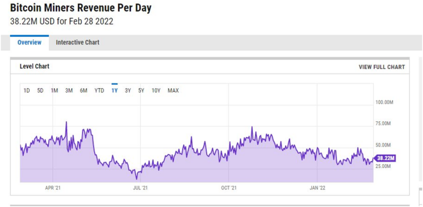 El máximo de ingresos de un solo día para los mineros de Bitcoin en febrero de 2022 fue de 50,02 millones de dólares, un 16% más bajo que el máximo del primer día del primer mes del año.