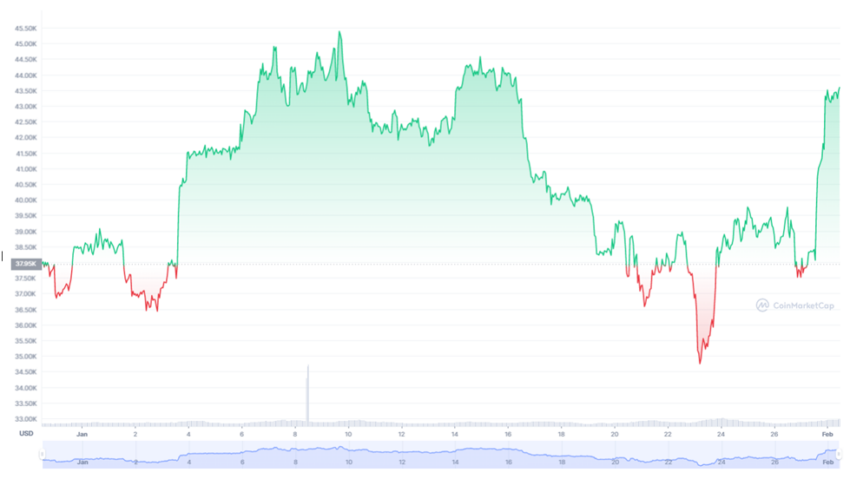 Bitcoin abrió en febrero a 38,841.77 dólares. El activo de alcanzó un máximo mensual de 45,661.17 dólares el 10 de febrero. BTC finalmente sintió los efectos de la invasión rusa de Ucrania el 24 de febrero y alcanzó un mínimo de un mes de 34,459.22 dólares.