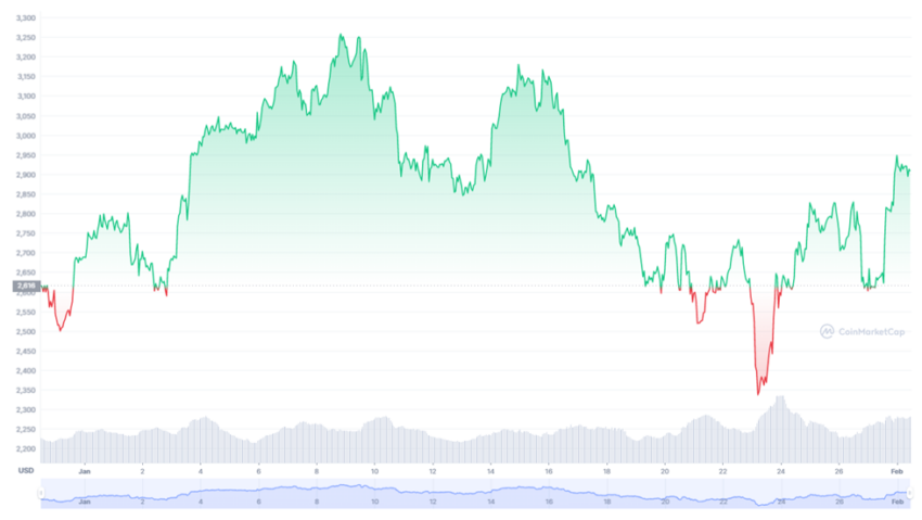Según BeInCrypto Research, Ethereum abrió en febrero con un precio de cotización de 2,687.90 dólares. El segundo activo digital más grande por capitalización de mercado alcanzó un máximo mensual de 3,271.32 dólares el 10 de febrero.