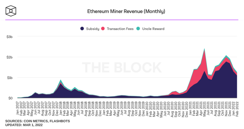 Antes de la caída de los ingresos por minería de febrero; enero de 2022 vio cómo los ingresos por minería de Ethereum superaban a Bitcoin en un 20%.