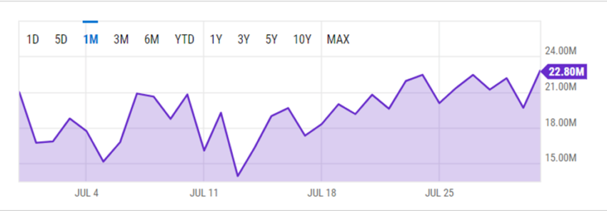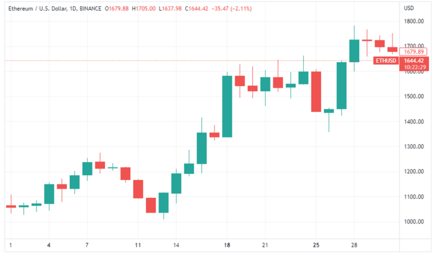 A lo largo de julio, Ethereum cotizaba entre 1,034 dólares y 1,760 dólares. En relación al mismo período de 2021, Ethereum cotizó en el rango de precios entre 1,722 dólares y 2,551 dólares.