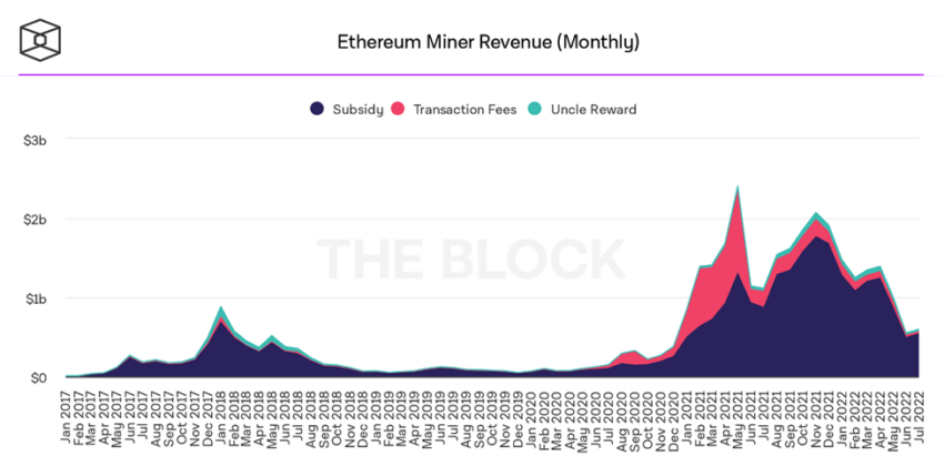 Al igual que Bitcoin, la minería de Ethereum también experimentó una caída mensual año tras año en julio. En julio de 2021 se generaron alrededor de 1110 millones de dólares en ingresos, mientras que la cifra de 2022 cayó un 46%.