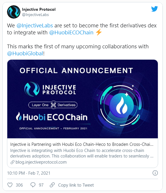 Injective es uno de los primeros equipos en utilizar la cadena Heco y las pruebas comenzaron en enero cuando su token INJ nativo se incluyó en el exchange centralizado.
