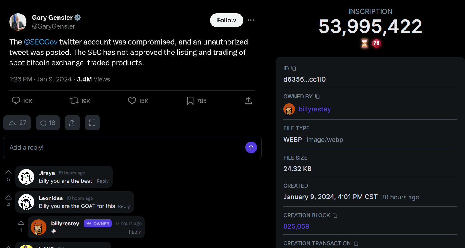 Luego de que Gary Gensler, confirmara que la cuenta de Twitter de la agencia reguladora fue comprometida y utilizada para anunciar falsamente la aprobación de un ETF de Bitcoin spot, alguien archivó la respuesta de Gensler en una Inscripción de Ordinals.