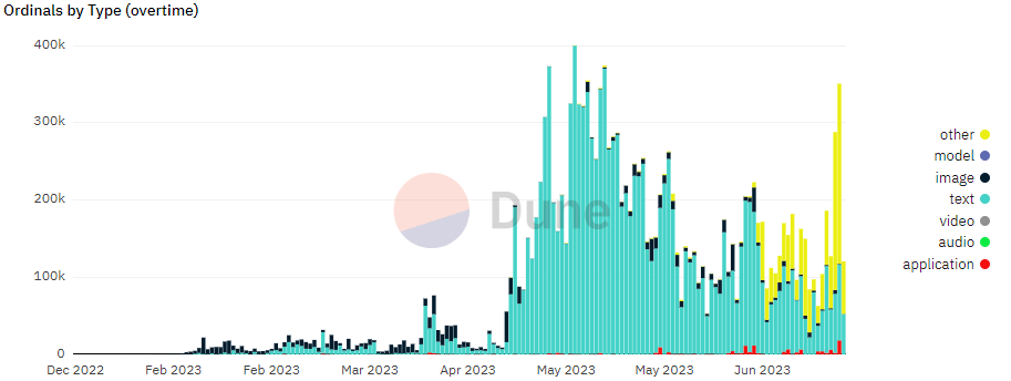 Como muestra un panel de análisis de Dune, las inscripciones que no son de texto han aumentado recientemente. Las inscripciones de archivos JSON y aquellos que caen en la categoría “otros” actualmente están impulsando la tendencia a la diversificación.