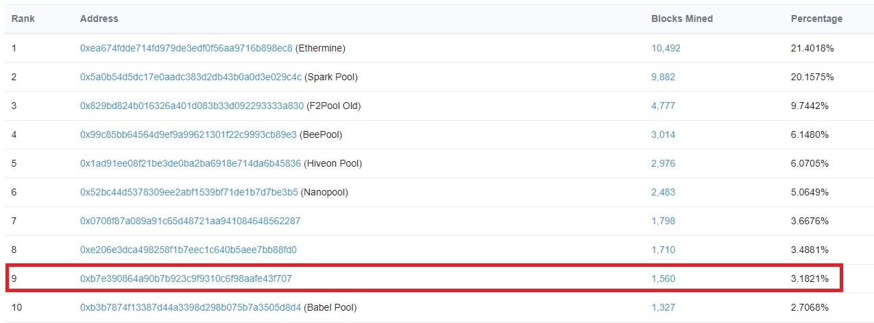 Otro detalle a destacar es que, la transacción se incluyó en un bloque extraído por un minero que se encuentra en el top 10 mineros por bloques extraídos durante los últimos siete días.