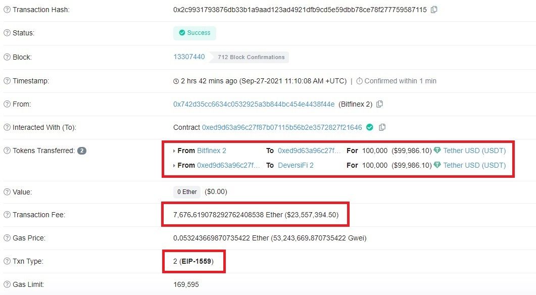 De acuerdo a los datos de Etherscan, la transacción fue realizada a las 11:10 (UTC), la cual fue enviada desde uno de los principales monederos de Bitfinex hacia uno de los monederos de la plataforma de trading de finanzas descentralizadas (DeFi) de Capa 2, DeversiFi.