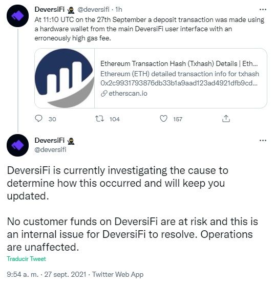 Los fondos de los clientes en DeversiFi no están en riesgo y este es un problema interno que DeversiFi debe resolver. Las operaciones no se ven afectadas”.