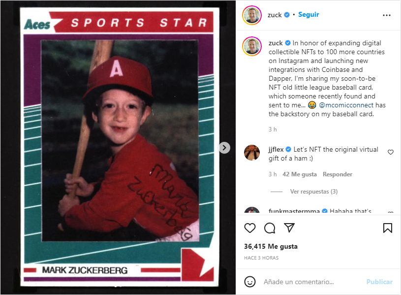 Como parte del anuncio, el CEO de Meta, Mark Zuckerberg, también ha decidido explorar el espacio de NFT con la nueva función. En una publicación en su cuenta de Instagram el fundador dijo que estaba convirtiendo una tarjeta propia que luce su fotografía de niño en un coleccionable digital.