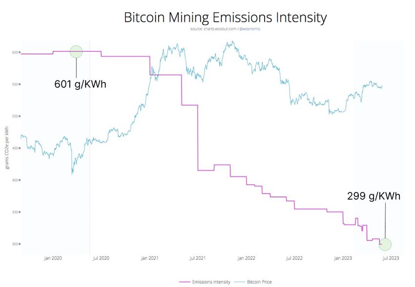 La intensidad de las emisiones de la minería de Bitcoin se encuentra en su nivel más bajo, cayendo por debajo de los 300 g/KWh por primera vez.
