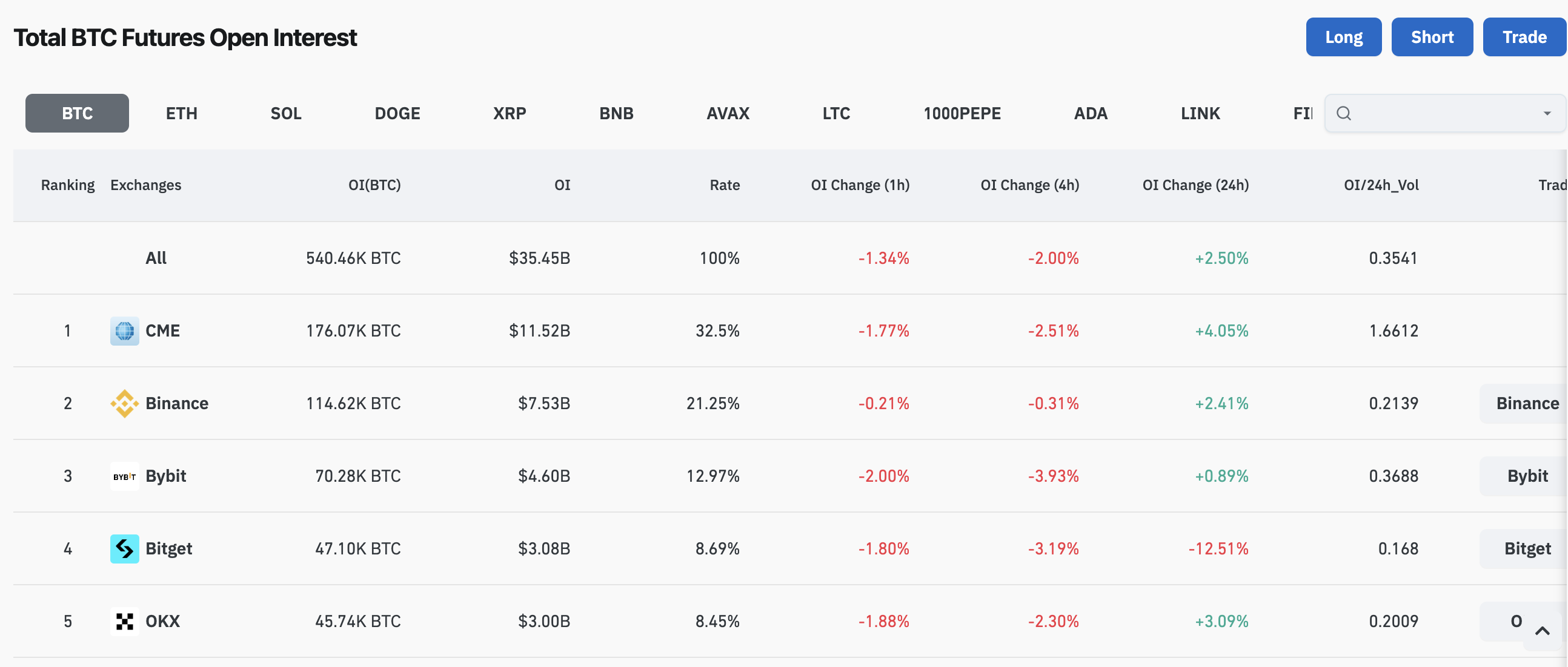 Datos de CoinGlass mostraron que la mayoría de contratos de interés abierto (OI) son de CME Group, con 176,07 mil BTC, equivalentes a 11,52 billones de dólares. Además, CME lidera el 32,5% de la oferta de interés institucional en la criptomoneda con mayor capitalización de mercado.