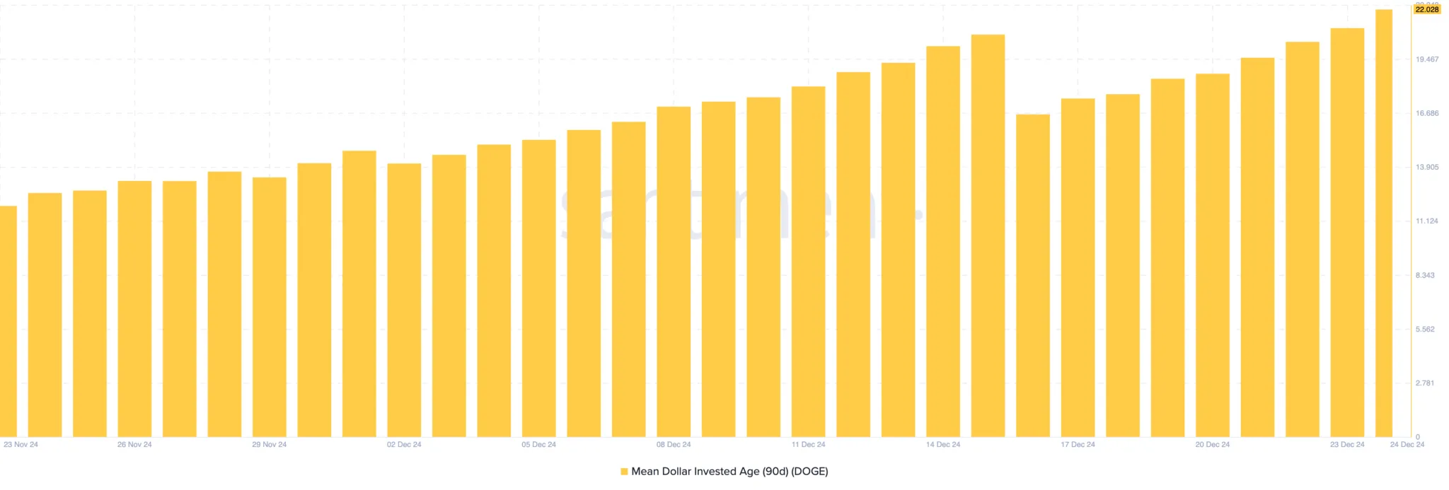 El Mean Dollar Invested Age (MDIA) es otro indicador que sugiere una mayor disminución en el precio de Dogecoin. Como su nombre lo indica, el MDIA es la edad promedio de todas las monedas en una blockchain ponderada por el precio de compra. Cuando el MDIA aumenta, sugiere que los holders están manteniendo sus monedas en monederos sin trading activo.