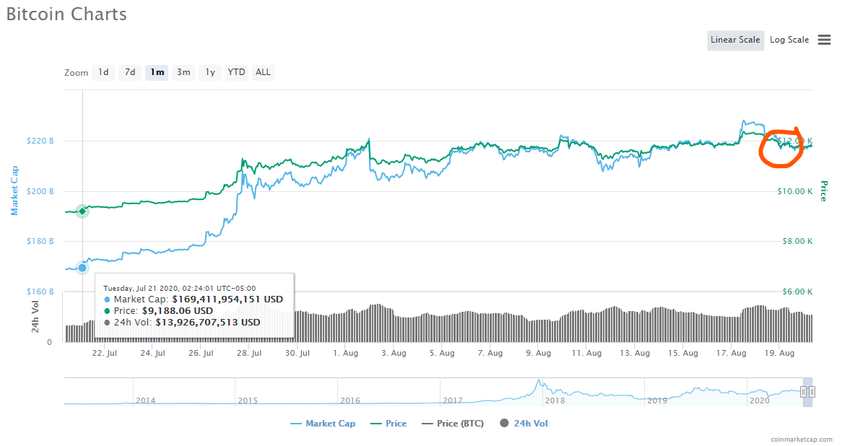 El gráfico de un mes de BTC muestra cuán pequeño fue el reciente retroceso | Fuente: Coinmarketcap