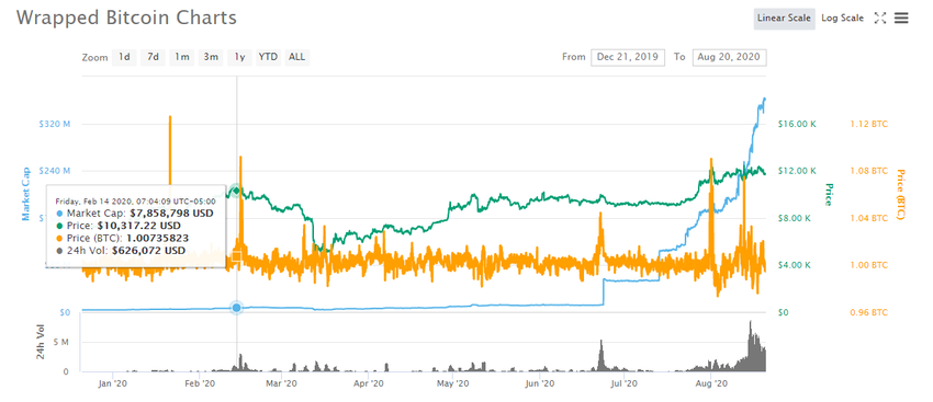 En el pico anterior de febrero de 2020, solo existían alrededor de 7 millones de dólares en bitcoin en WBTC.