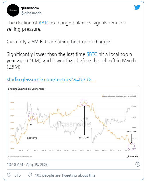 Otra métrica que sugiere un mercado alcista continuo es la cantidad de bitcoin que se mantiene en los exchanges. De hecho, actualmente se mantienen alrededor de 2,6 millones de BTC.