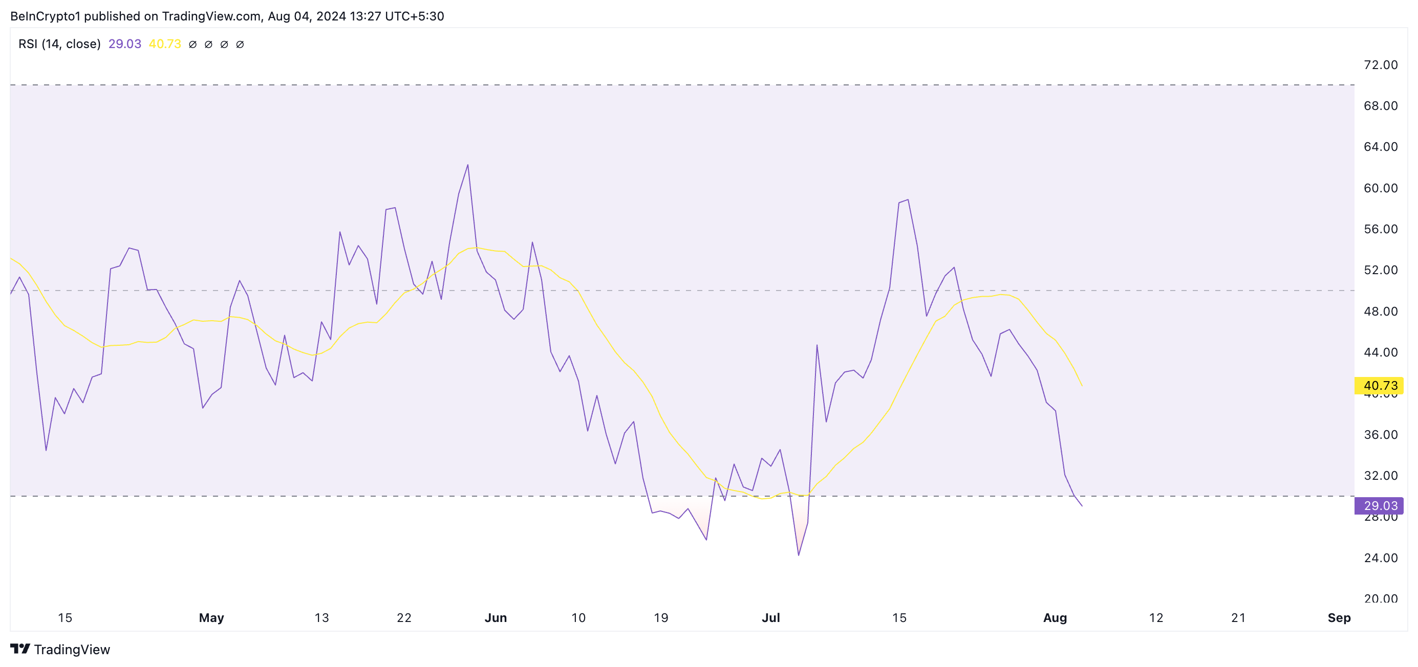 El Índice de Fuerza Relativa (RSI) de SHIB, evaluado en un gráfico diario, sugiere un posible rebote en el precio. En el momento de la publicación, el valor del indicador es de 29.03.