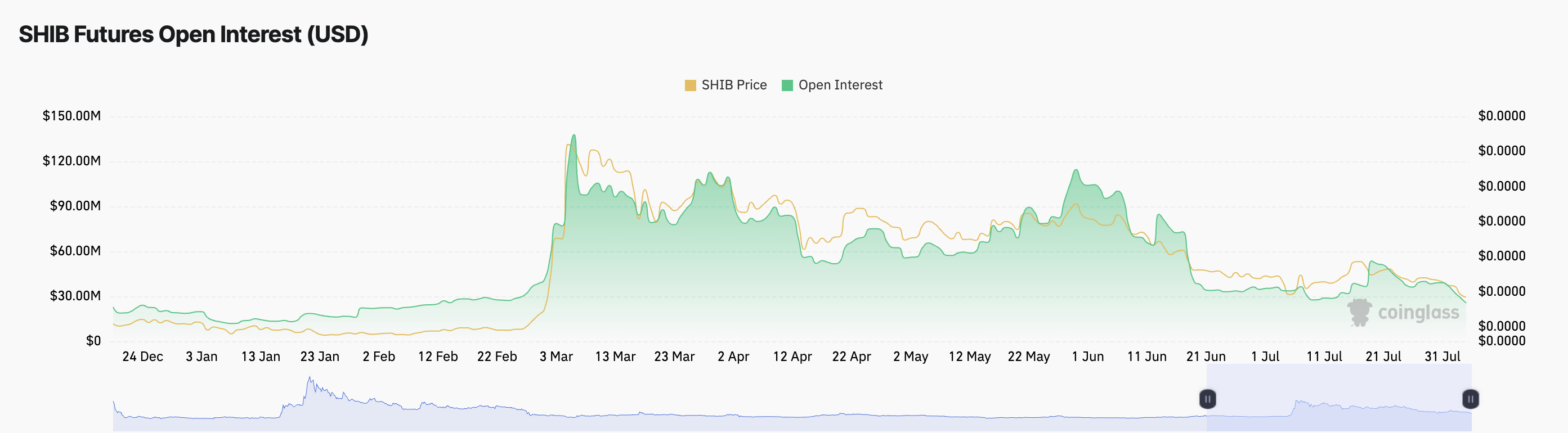 Según Coinglass, el interés abierto de futuros de SHIB es de 26 millones de dólares. Ha disminuido constantemente desde el 19 de julio, cayendo un 51% en los últimos 16 días.