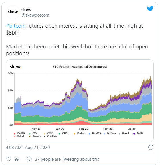 El interés abierto total en todos los futuros de Bitcoin ha alcanzado un nuevo máximo histórico (ATH), según los datos de skew.
