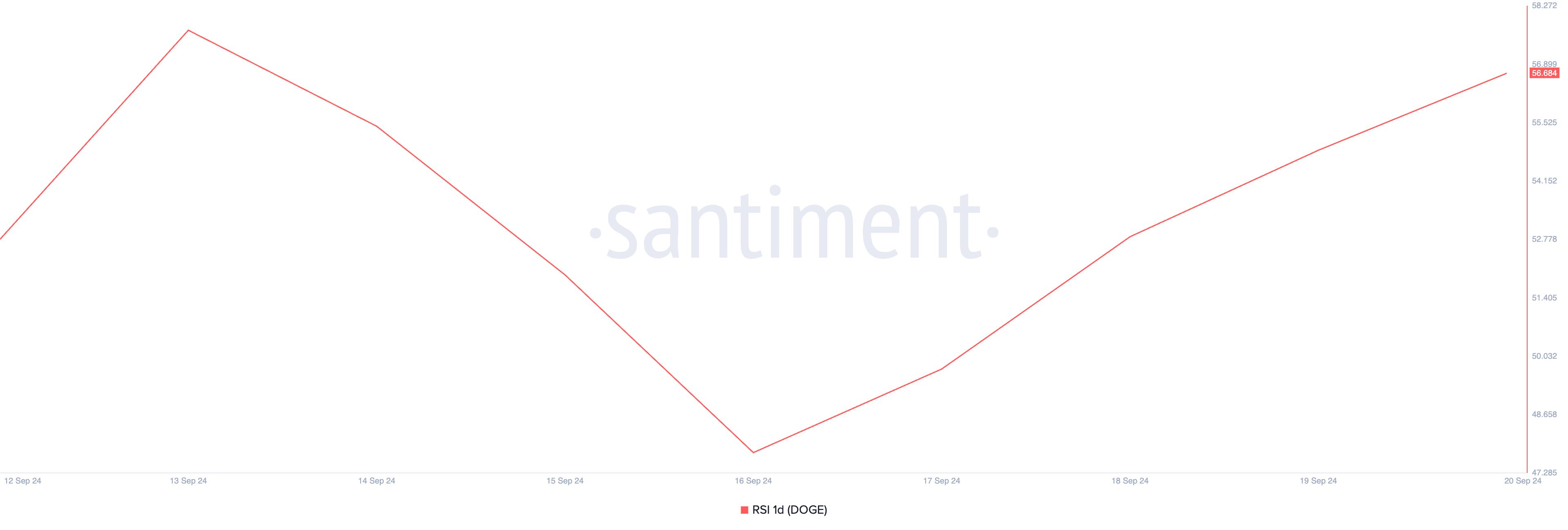 El creciente Índice de Fuerza Relativa (RSI) de Dogecoin es un buen indicador del aumento en la demanda de la memecoin. Este indicador de momento, que mide las condiciones de mercado sobrecompradas y sobrevendidas de la moneda, está en 56.68 y en una tendencia alcista en este momento.