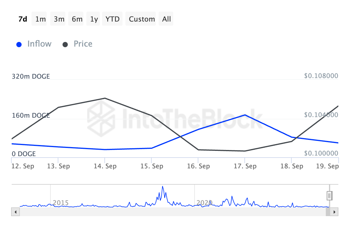 La principal memecoin, Dogecoin (DOGE), ha estado en auge esta semana, con su precio aumentando casi un 5%. Este aumento se debe a una combinación de demanda creciente y un aumento en las entradas de ballenas.