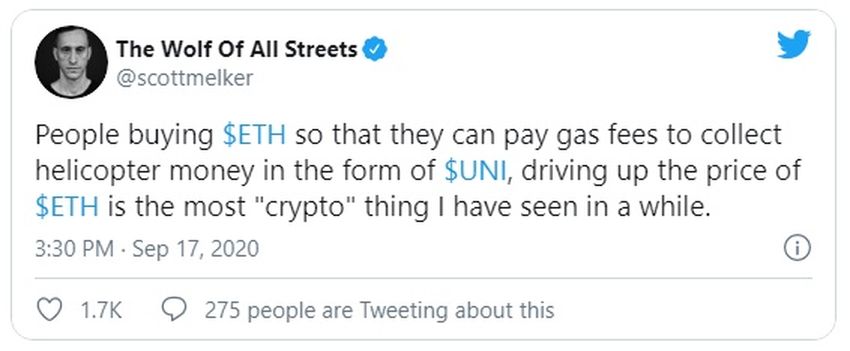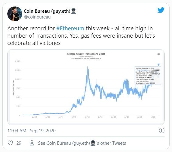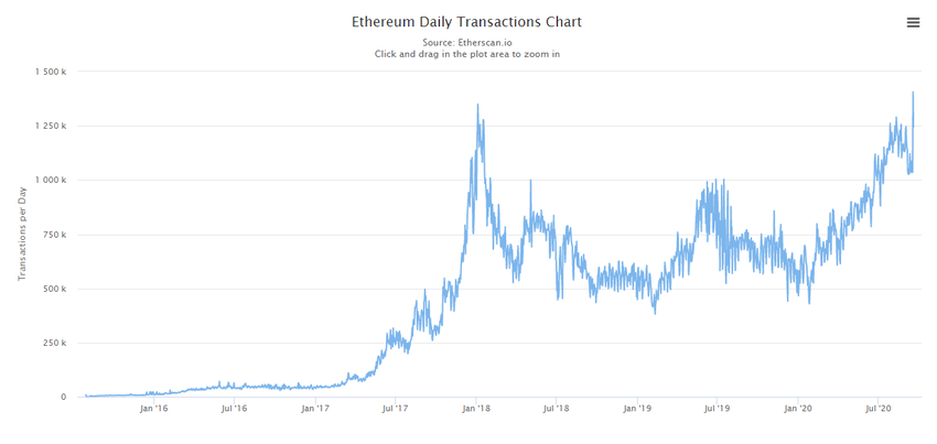 El flujo diario de transacciones de Ethereum fue impulsado por un frenesí en el espacio de las finanzas descentralizadas (DeFi) que ha puesto al mercado en un estado de nerviosismo. Según el Cuadro de transacciones diarias de Ethereum, el máximo histórico se alcanzó el 17 de septiembre, cuando este indicador se registró en 1.406.016. La última vez que se acercó a estos niveles fue en enero de 2018, cuando la locura de las ICO estaba en su apogeo.