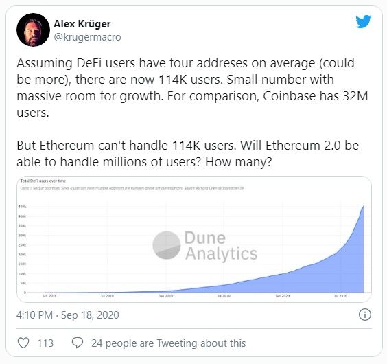 El economista y trader Alex Kruger sugirió en un tweet que la cantidad de usuarios de DeFi podría ser de alrededor de 114,000, según sus cálculos. Señala que es una cifra baja en comparación con Coinbase, que cuenta con 32 millones de usuarios y, por lo tanto, tiene un “espacio enorme para el crecimiento”.
