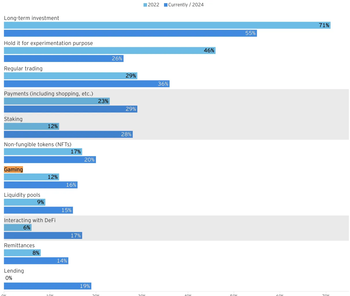 Cuando repitieron la encuesta entre 2022 y 2024, los activos de juego solo vieron un aumento del 4% y se ubicaron en el séptimo lugar en general. Con una mayor interoperabilidad, los jugadores estarían más inclinados a invertir si eso significara más valor por su dinero. Los desarrolladores se benefician igualmente de la interoperabilidad.