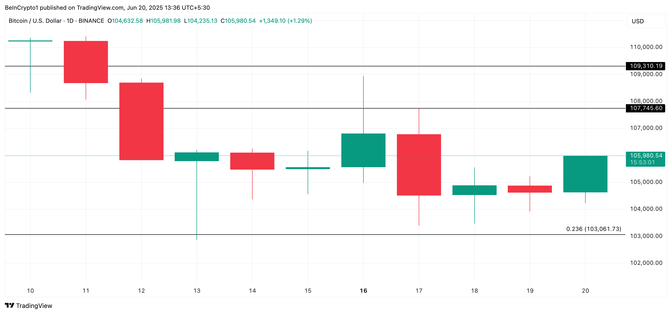 Al momento de la publicación, la criptomoneda se negocia a 105,980 dólares. Si el sesgo alcista aumenta, el precio de la moneda podría experimentar un rally y subir hacia 107,745 dólares.