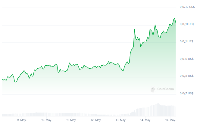 PEPE, la memecoin inspirada en la rana Pepe the Frog, ha experimentado un repunte significativo en la última semana, ganando más del 40% para alcanzar un nuevo máximo histórico de 0.00001151 dólares.
