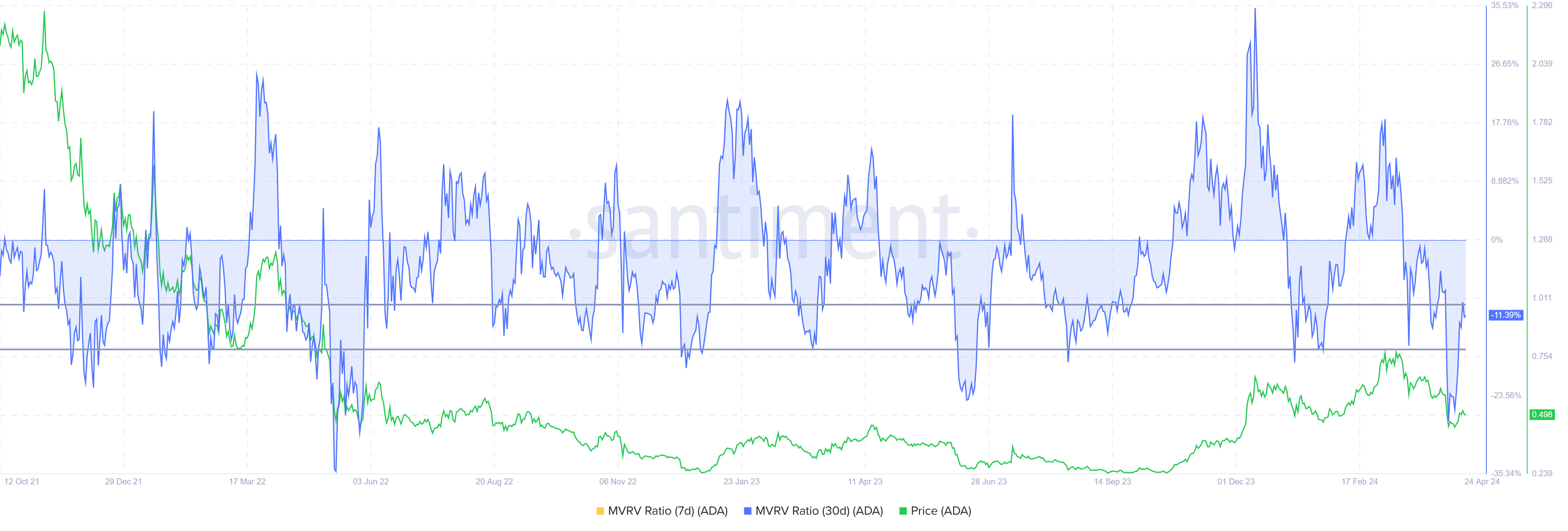 En segundo lugar, ADA también podría ser testigo de un aumento en la compra ya que la altcoin se encuentra en la zona de oportunidad basada en el MVRV ratio. El MVRV ratio mide las ganancias/pérdidas de los inversores.