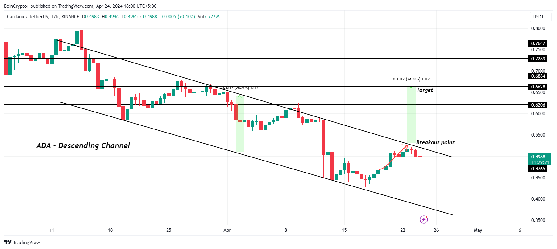 Sin embargo, si la ruptura falla y ADA pierde el soporte de 0.47 dólares, es probable que se produzca un retroceso hasta los 0.40 dólares. La caída a través de esto invalidaría la tesis alcista, enviando a ADA a caer aún más.