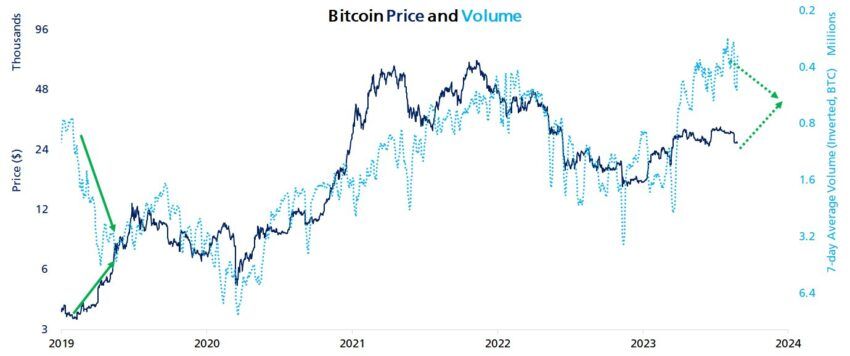 Si “probamos” los patrones de la criptomoneda de años pasados, se podría predecir su caída a 24,000 dólares, con una nueva recuperación a 30,000 dólares a principios de 2024.