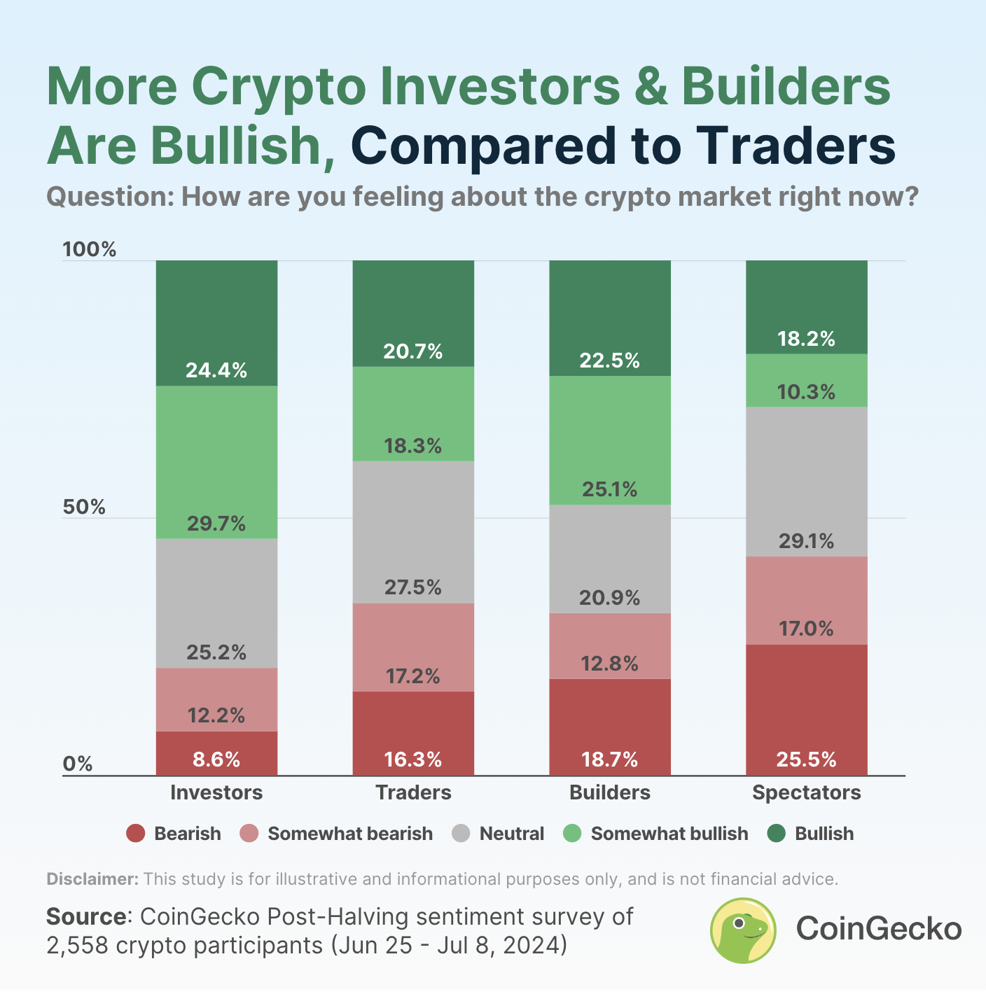 La encuesta analizó diferentes grupos dentro de la comunidad cripto, revelando sentimientos distintos entre varios roles. Notablemente, el 54.1% de los inversores son optimistas sobre el potencial a largo plazo del mercado, demostrando una firme creencia en el valor sostenido de las criptomonedas.