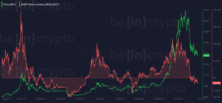 Mientras tanto, el indicador de valor de mercado anual por realizar (MVRV de 365 días) ha alcanzado un mínimo. Al cierre de este artículo, su porcentaje era del -14,9%.