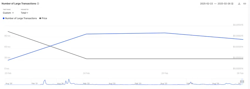Además, durante el período analizado, el número de grandes transacciones que involucran a SHIB ha aumentado, lo que indica una mayor actividad de los actores institucionales y las ballenas. Según los datos de IntoTheBlock, las grandes transacciones (aquellas que superan los 100,000 dólares) han aumentado significativamente.