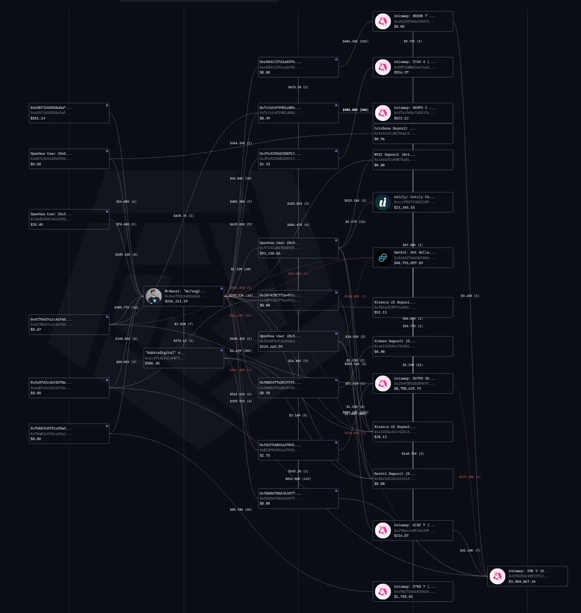 SponsoredLoock Advising alegó que las acciones de MrBeast se centraron en el esquema de inside trading y en las manipulaciones de mercado. Un componente central de su operación es una vasta red de monederos secretos. Esta táctica ha sido comúnmente utilizada en el pasado, permitiendo a los usuarios inflar el precio de activos que poseen en secreto.
