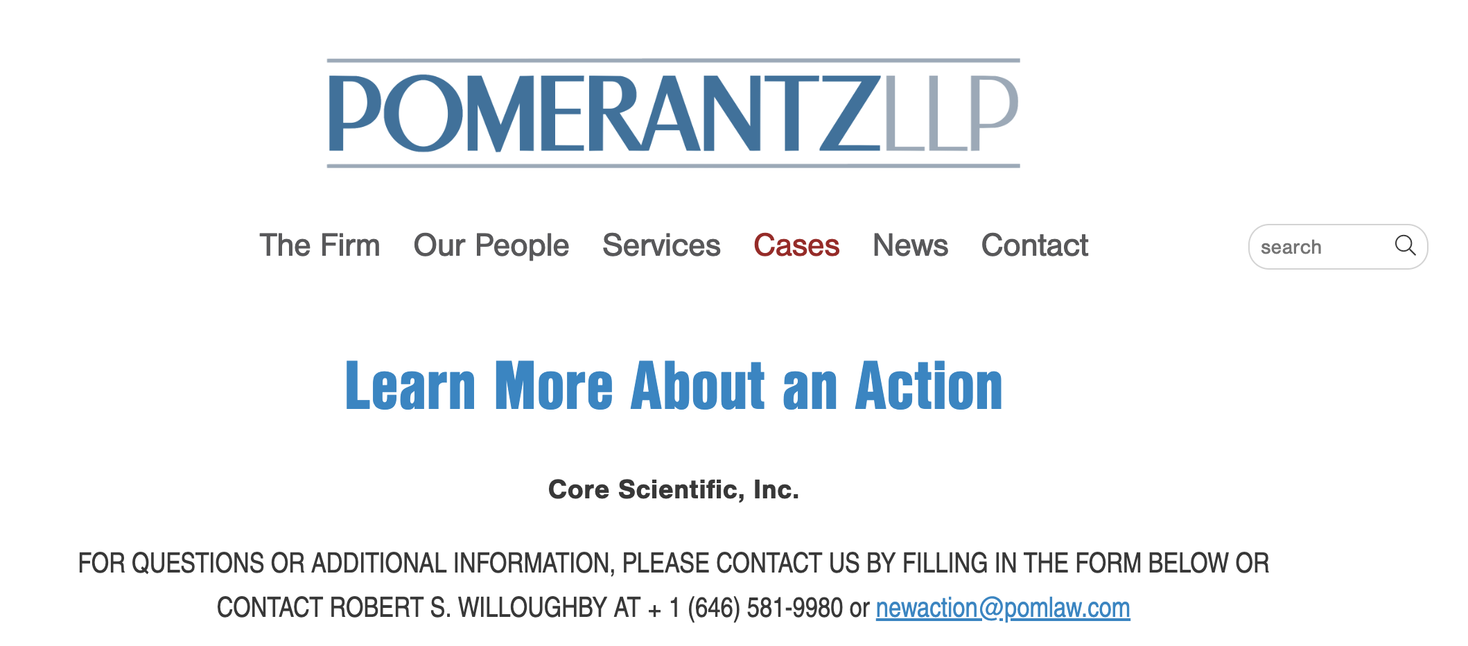 Pomerantz también ofreció un enlace dirigido a las personas que quieran conformar una demanda colectiva en contra de Core Scientific. La firma se posicionó, tiempo atrás, como una de las empresas con mayor hashrate (poder de cómputo) para el procesamiento de la red Bitcoin.