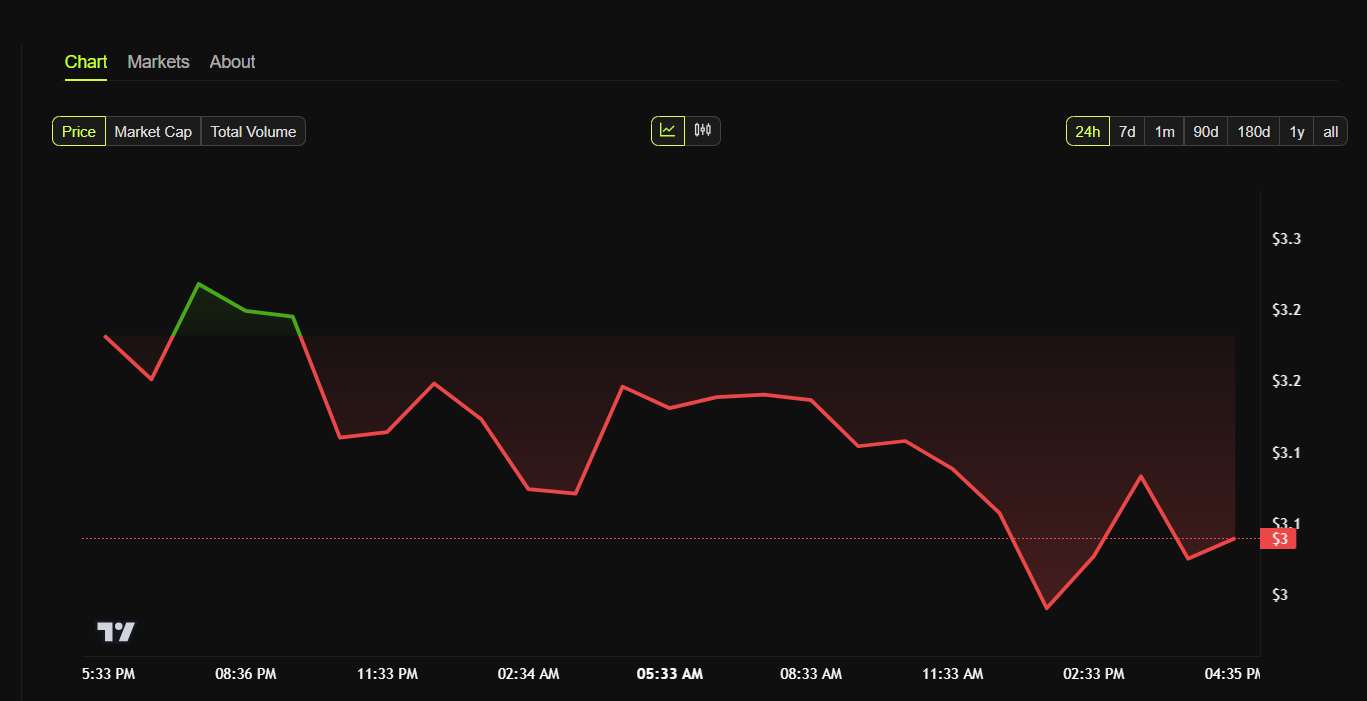 A pesar de los desarrollos recientes, el token IO del proyecto DePIN ha experimentado una notable volatilidad en el mercado. Al momento de la publicación, el token se negociaba a 3 dólares, con una caída de aproximadamente 6% en las últimas 24 horas.